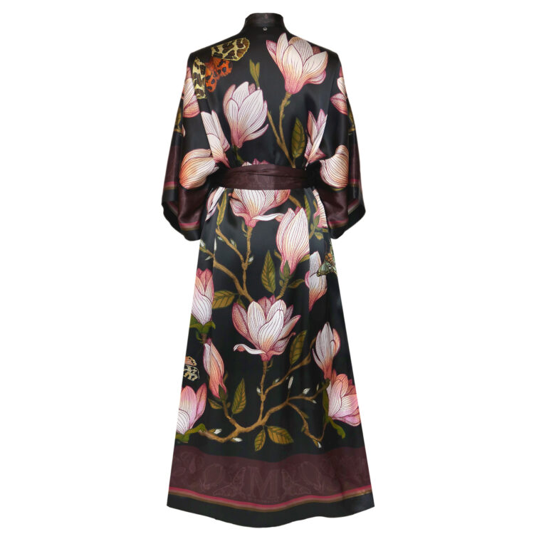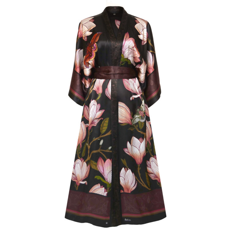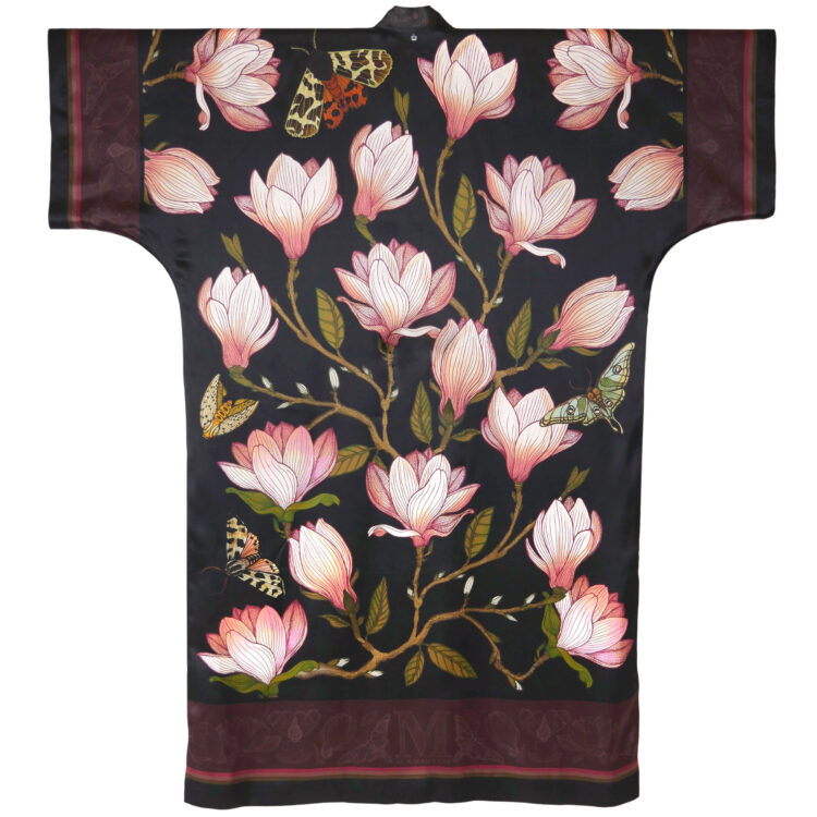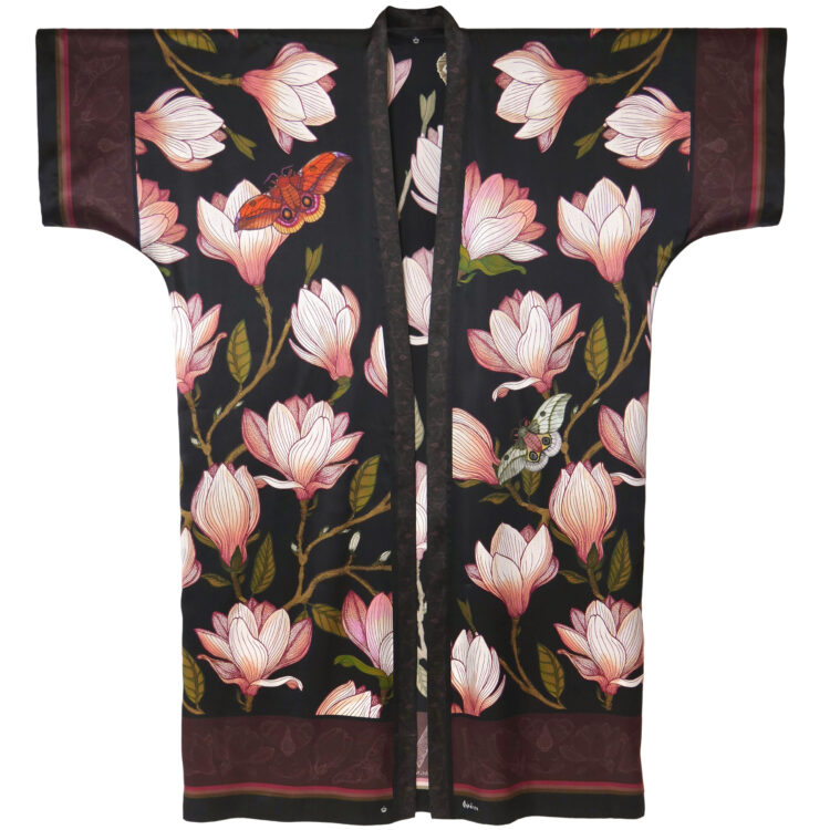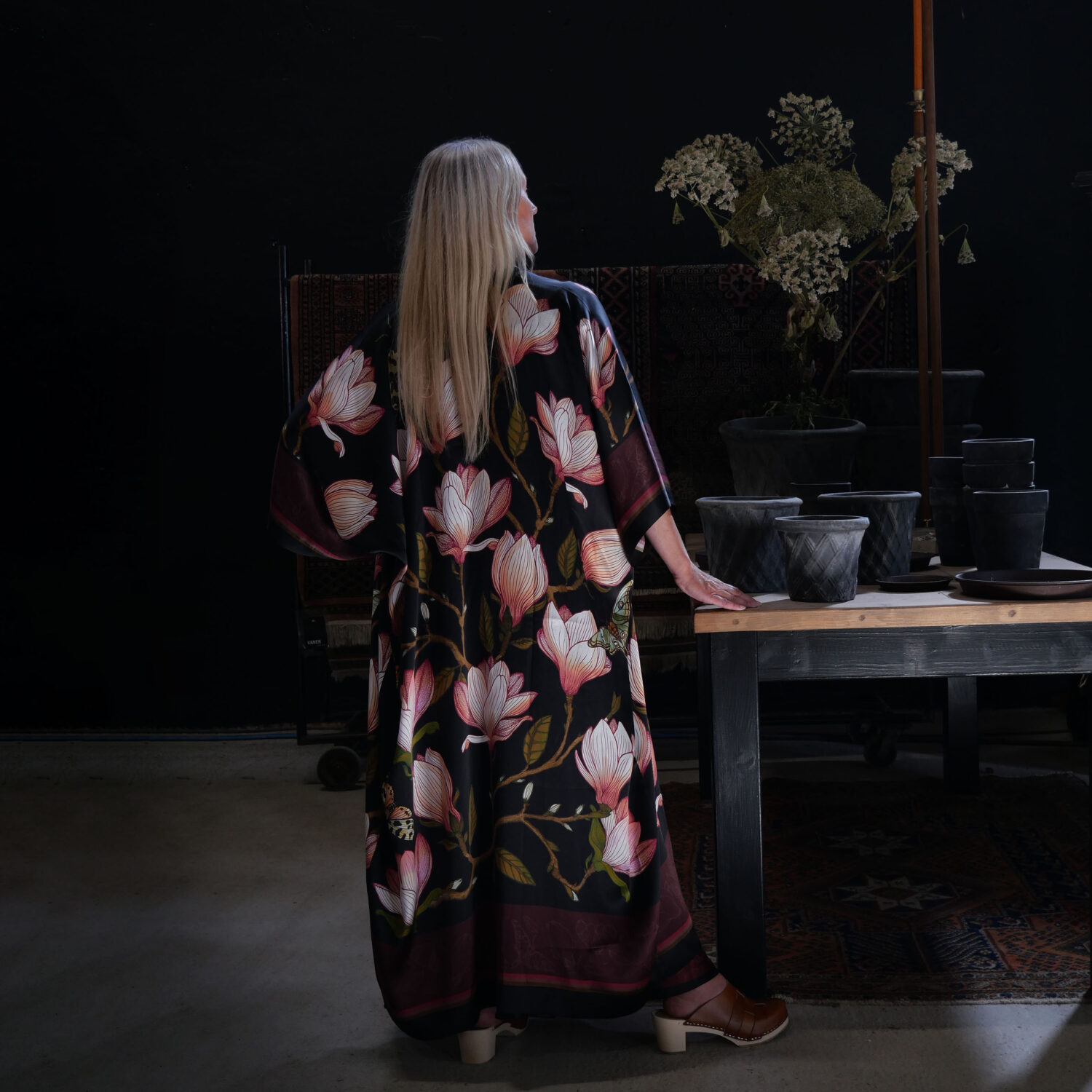 Designen på denna kimono är byggd av magisk magnolia och mystiska malar. Malarna, nattens utforskare. Dragna mot ljuset med en nästan oförklarlig längtan, som om de följer en osynlig kompass. Jag tycker de förkroppsligar en kraft som lockar oss att fortsätta framåt, oavsett hur dunkel omgivningen verkar vara. Modet att röra sig mot det okända – att våga närma sig det som drar oss, även om vi inte förstår varför. Att följa sin passion.