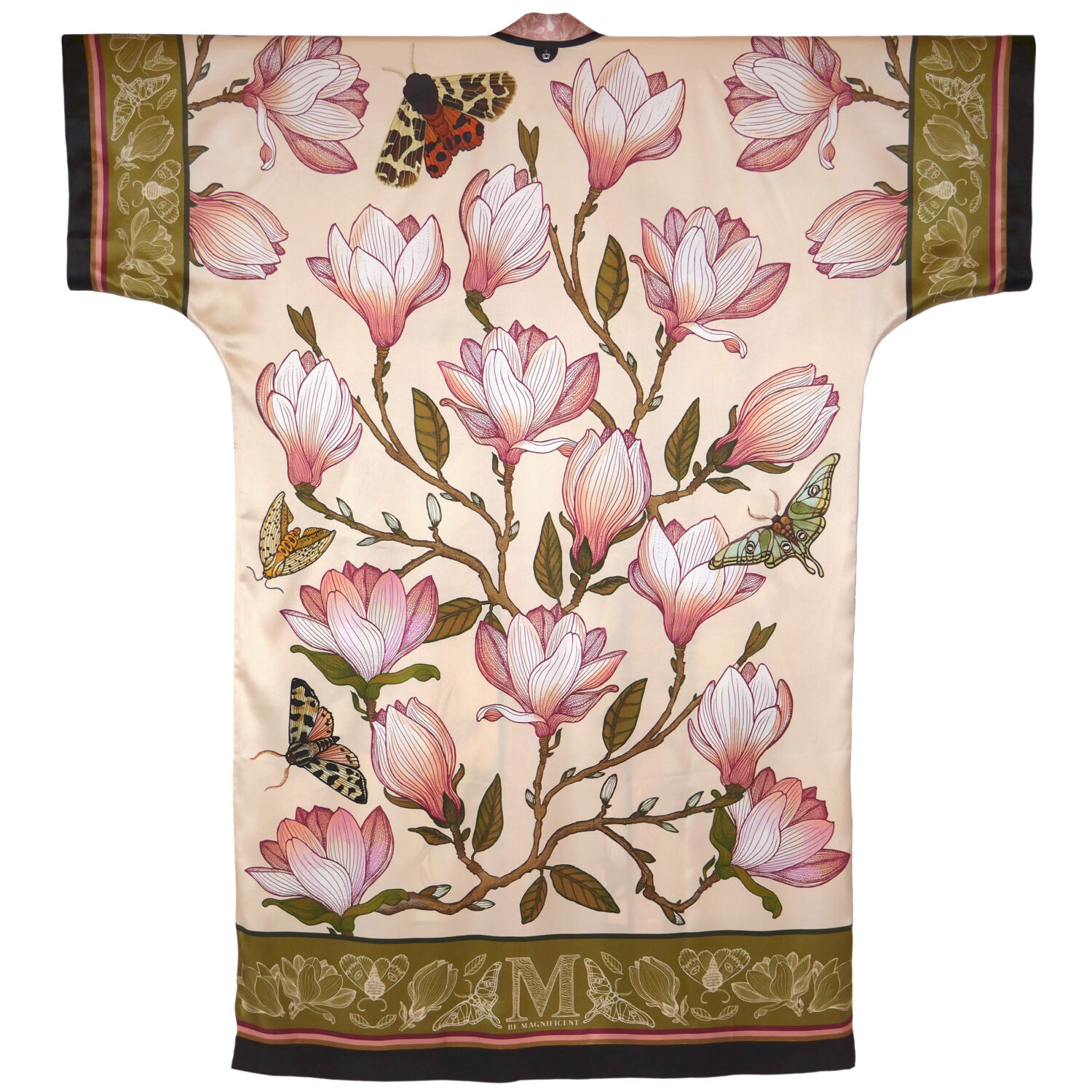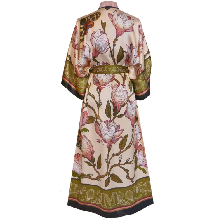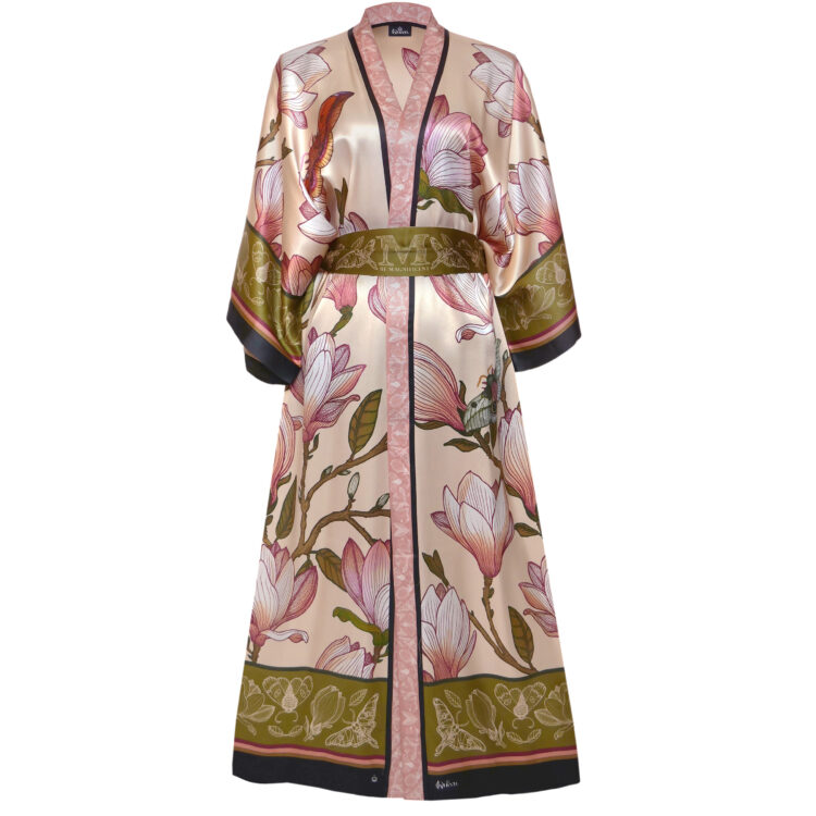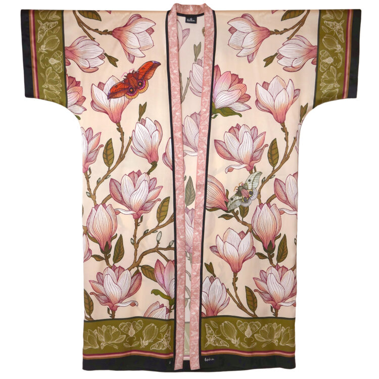Designen på denna kimono är byggd av magisk magnolia och mystiska malar. Malarna, nattens utforskare. Dragna mot ljuset med en nästan oförklarlig längtan, som om de följer en osynlig kompass. Jag tycker de förkroppsligar en kraft som lockar oss att fortsätta framåt, oavsett hur dunkel omgivningen verkar vara. Modet att röra sig mot det okända – att våga närma sig det som drar oss, även om vi inte förstår varför. Att följa sin passion.