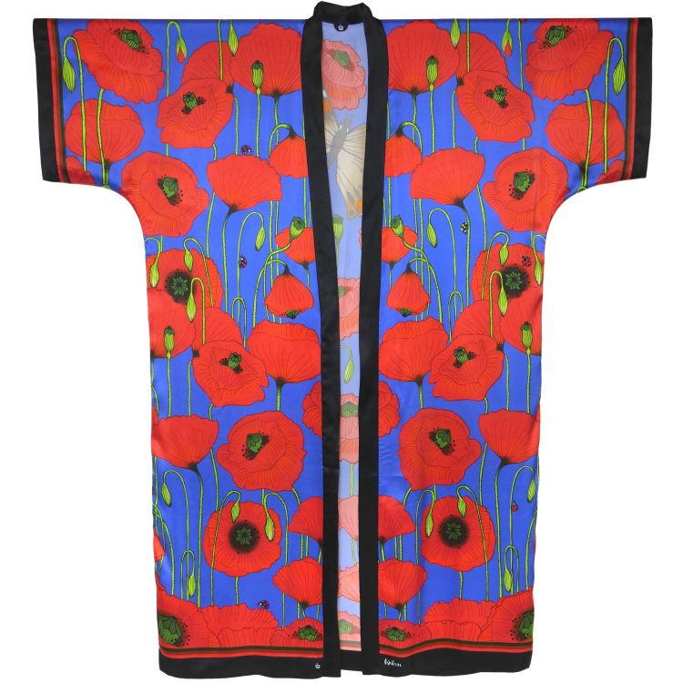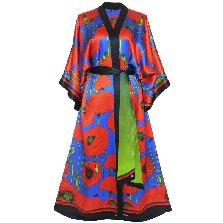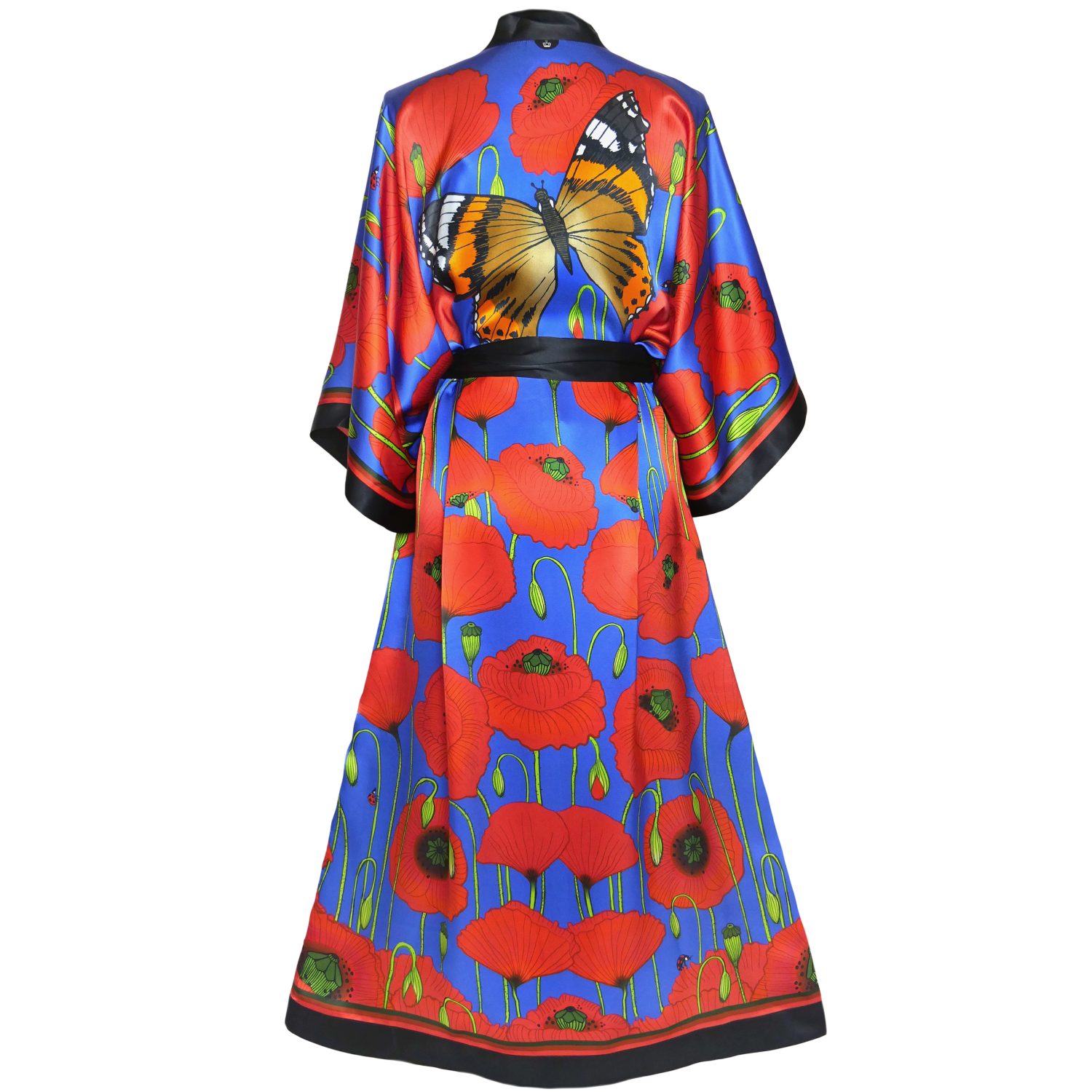 Lyxig kimono i 100% sidensatin. Rak modell som är lika vacker öppen och svepande som knuten med det långa sidenscarf/skärpet i midjan.