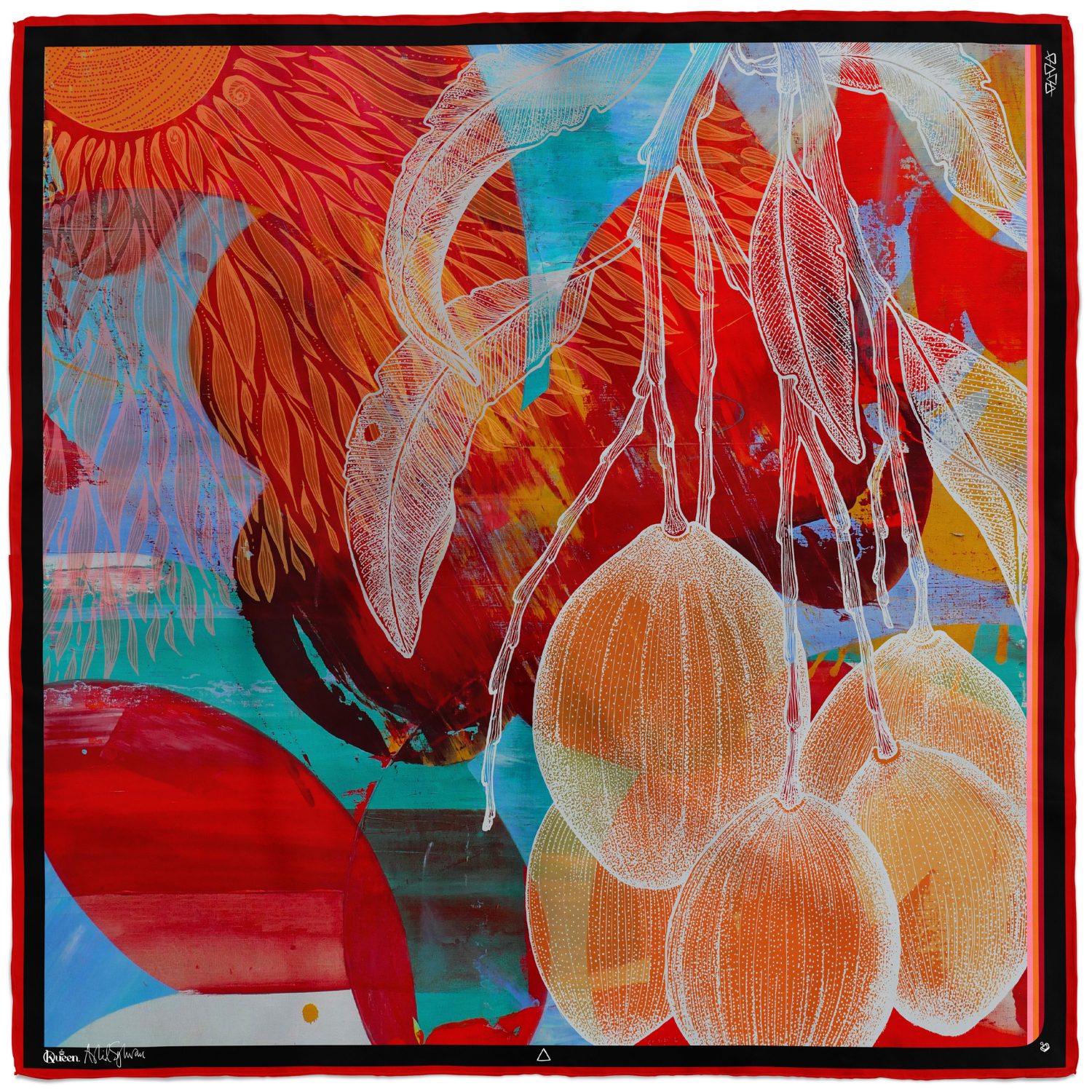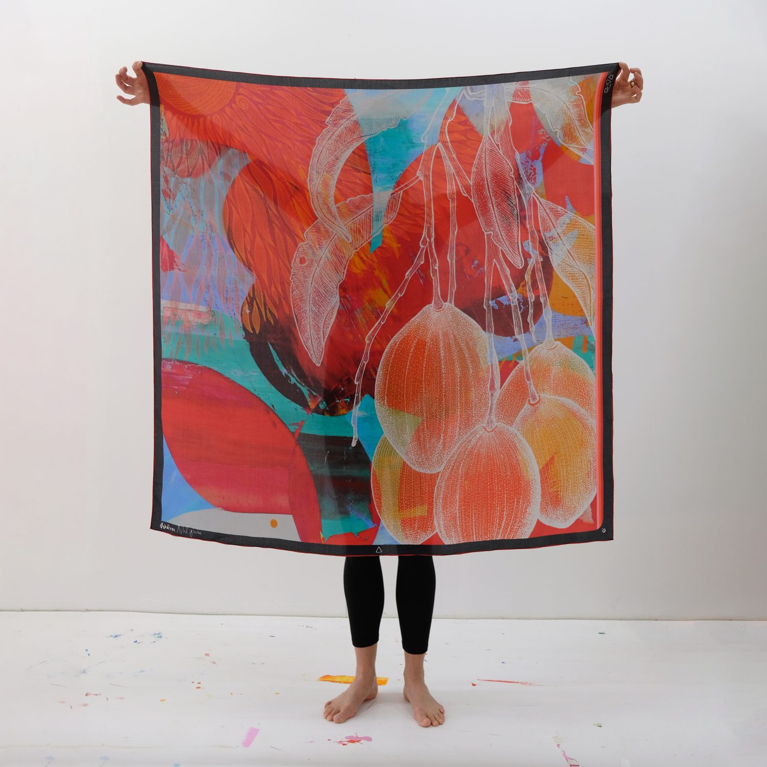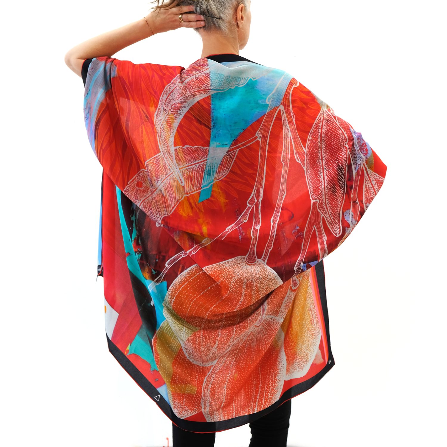 Kimonos och Scarves i kollektion ”De fyra elementen” är ett samarbete med konstnären Astrid Sylwan. Astrids abstrakta tolkningar av elementen gifter ihop sig med Karolines Beritdotter Lenhults figurativa illustrationer och mönster på ett briljant vis. En färgfest av väl avvägda kombinationer som speglar elementen jord, luft, vatten och elds unika karaktärer.