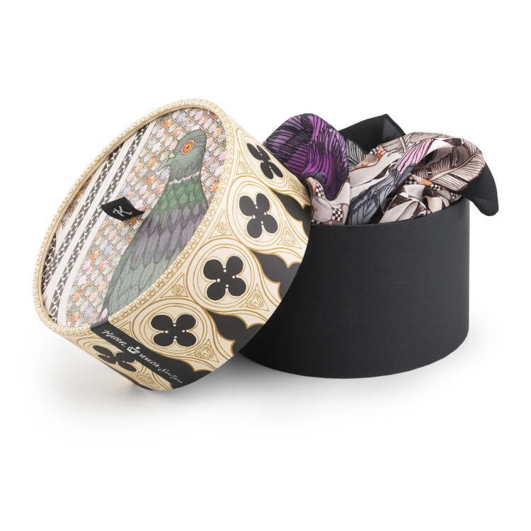 Varje scarf från Kueen kommer alltid i en unik ask. Asken kan bli en fin inredningsdetalj och som förvaring i ditt hem. Du kan förvara din scarf i den eller något annat du tycker om. I asken hittar du också en galge till din scarf. Häng upp den på en fin krok på väggen eller i din garderob. Scarfen håller sig alltid slät och fin när det är dags att sätta på sig den. Scarfen är gjord i 100% siden, så kemtvätt är såklart att föredra.